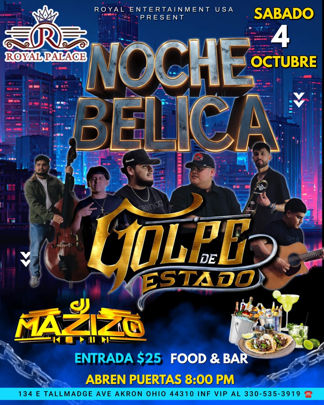 Royal Entertainment USA presents Noche Bélica at Royal Palace featuring Golpe de Estado and DJ Mazizo.Enjoy live music, food & bar service in a vibrant night atmosphere.