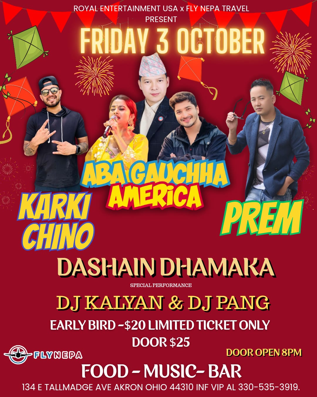 Royal Entertainment USA x Fly Nepa Travel present Dashain Dhamaka – a festive night of live Nepali music and entertainment featuring Aba Gauchha America, Karki Chino, Prem, and more. Celebrate Dashain with food, drinks, and music all night long.